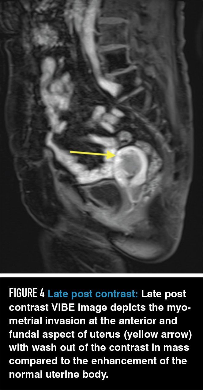 The incremental additional clinical information that is gained with use of GBCA in MRI evaluation of variant pelvic anatomy and suspected benign pathology is small. Adding GBCA has been shown to improve evaluation of myometrial invasion from endometrial carcinoma13 and identification of the correct primary tumor when there are multiple sites of biopsy-proven uterine adenocarcinoma.14 Contrast may also be useful in identifying vulvar cancers and occult inguinal metastases15 and it has shown to be useful in identifying neoplastic nodules within complex adnexal lesions and distinguishing endometriosis from pelvic inflammatory disease.16,17