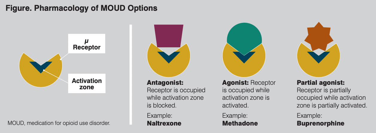 After confirmation of OUD, treatment should be offered. The standard of care for OUD rests on medications. Methadone and buprenorphine are the safest and most effective MOUDs in pregnancy. There are less data for naltrexone in pregnancy. These 3 medications differ in pharmacology: Methadone is a full opioid receptor agonist, buprenorphine is a partial agonist, and naltrexone is an opioid antagonist28 (Figure). The μ-opioid receptor is the primary site of action and is responsible for many of the favorable aspects of opioids, namely euphoria, analgesia, and stress coping. However, MOUD also exerts activity on both δ- and κ-opioid receptors, which are important to understand in terms of potential medication adverse effects. δ-Receptor activation leads to anxiolysis and positive affect, whereas κ activation is associated with dysphoria, stress, and negative affect.29 Methadone is a full agonist at the μ, δ, and κ receptors; buprenorphine is a partial μ agonist and a δ and κ antagonist; and naltrexone is an antagonist at the μ, δ, and κ receptors.30