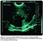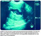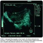 A reliable assessment with ultrasonography (U/S) requires that the endometrial echo be homogeneous, surrounded by an intact hypoechoic junctional zone, and that the operator constantly remember that the en- dometrial cavity is a three-dimensional structure. This may account for why Dijkhuizen and associates had four cases that supposedly measured less than 10 mm (some as little as 2 mm) and yet at hysteroscopy displayed polyps.20 Such cases underscore the importance of the three-dimensional character of the endometrial cavity and the occasional propensity of ultrasonographers to obtain a limited number of two-dimensional views and assume that these represent the entire endometrial cavity. Any one "frozen" U/S image is nothing more than a two-dimensional "snapshot," and failure to meticulously recreate three-dimensional anatomy will result in errors (Figures 6 and 7).