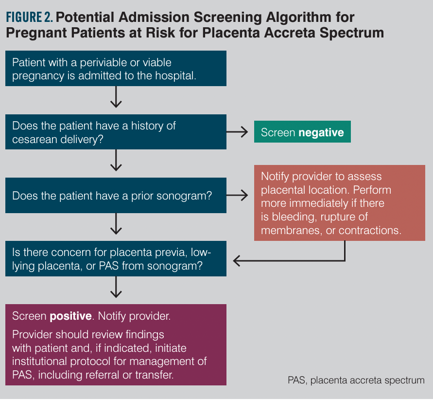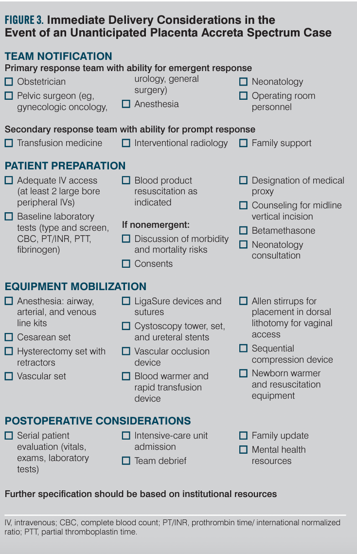 Texas House Bill 1164, which took effect in September 2021, requires that only centers with maternal level of care IV designation (or level III centers meeting all level IV center requirements for PAS) provide care for suspected PAS patients.35 This includes a multidisciplinary team with expertise for screening, evaluation, diagnosis, consultation, and management of PAS, including surgical and postpartum care. All hospital levels must have written guidelines and protocols in place for unanticipated PAS cases. Internal staff education and quality assurance/performance improvement are also required. Education is suggested via both formal lecture and simulation. Fostering telemedicine for referral and transfer as well as external outreach is required of centers that care for PAS patients. Given the increasing contribution of PAS to maternal and fetal morbidity and mortality, it is likely that in the future additional states will follow suit with similar requirements. To be proactive, hospitals and their providers should develop an admission screening process to flag women at risk for PAS. They also should develop checklists and protocols in the case of unanticipated PAS to enable system readiness. Suggested outlines for admission screening and immediate delivery considerations of unanticipated PAS are provided in Figures 2 and 3. The Society for Maternal-Fetal Medicine recently released a special statement that included an emergency checklist, planning worksheet, and system preparedness bundle for PAS.36 These provide extensive guidance on pre-, intra-, and postoperative considerations and interdisciplinary team optimization. Additional resources can be found via the American College of Obstetricians and Gynecologists District XI’s webinar on PAS.37