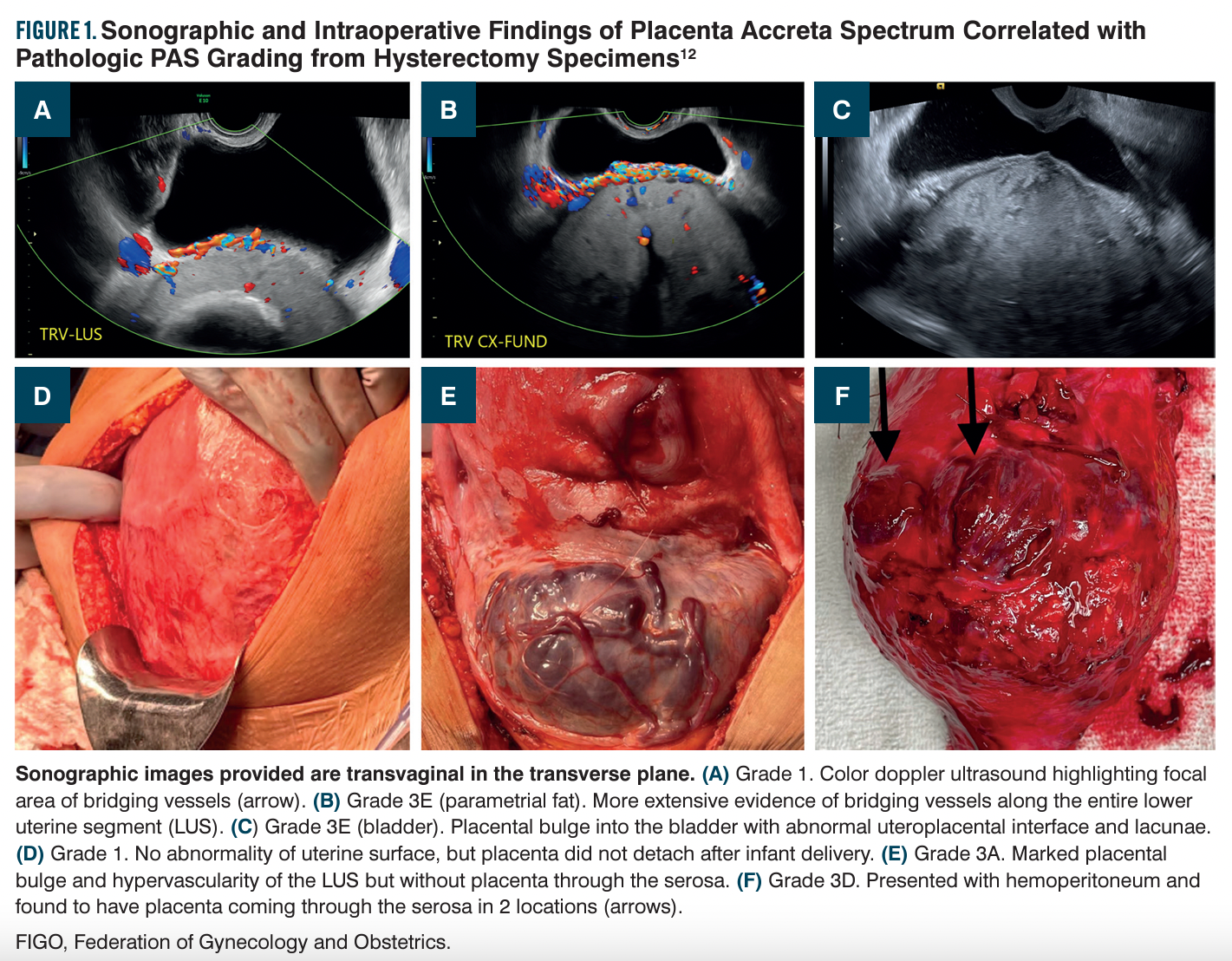 Prenatal diagnosis of PAS is based on suspicion from obtained imaging. Further classification is then determined based on clinical intraoperative findings and pathology. Traditional classifications were based on the layer of the uterus impacted and defined as accreta (loss of intervening decidua), increta (trophoblasts into the myometrium), and percreta (trophoblastic invasion through the serosa with possible extension to surrounding structures).23 Recently there has been recognition that more universal language is necessary for clinical and pathologic diagnosis of PAS that allows for better disease correlation and enhanced external validity. In 2019, an expert consensus panel on behalf of the International Federation of Gynecology and Obstetrics (FIGO) released guidelines for clinical diagnosis of PAS with a descriptive grading system.24 Accreta is now grade 1 and consistent with no separation of the placenta or placenta separation resulting in hemorrhage at the implantation site requiring further intervention. Increta is now grade 2 and consistent with the presence of uterine/placental bulge and hypervascularity. Percreta is now grade 3 with subdivisions based on where placental tissue is seen: through the serosa (3A), into the bladder (3B), or with extension into other pelvic organs (3C). In 2020, another expert panel released classifications and reporting guidelines for pathologic diagnosis that parallel the FIGO guidelines.25 Reassuringly this pathologic grading system has been found to correlate with clinical outcomes.26