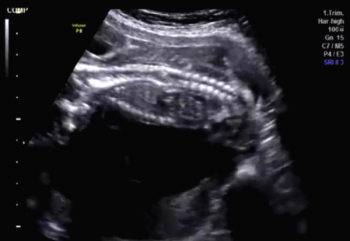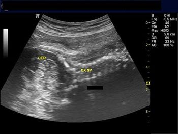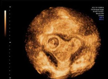 These images from a routine ultrasound examination of a 20-week fetus reveal a rare abnormality of the fetal spine.