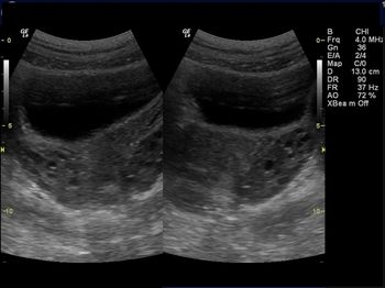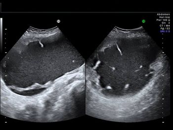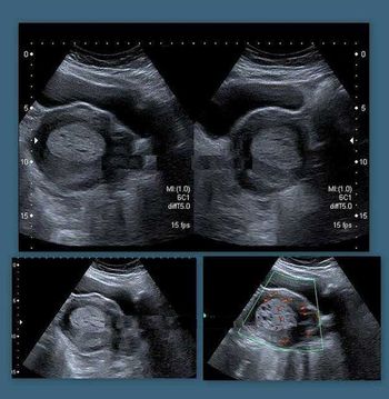 When a 35-year-old woman presented for her first ultrasound at 30 weeks’ gestation, the images revealed a very rare condition. Can you identify it?