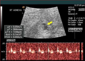A 29-year-old gravida 10, para 3 (1 term gestation, 1 preterm gestation of twins, 1 stillbirth at 5 months, 2 spontaneous abortions, and 4 elective abortions) presented to the clinic at about 5 weeks’ gestation with abdominal pain and vaginal bleeding. She described the pain as sporadic, mostly on the left side, exacerbated by movement, and resolving with rest, and the bleeding as initially intermittent but then heavier “like a period.”