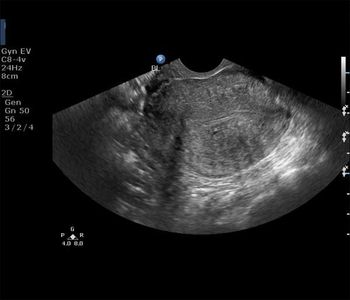 There is a clearly defined rounded mass just below the endometrial stripe of the uterus. The endometrium itself appears normal in thickness ruling out hyperplasia.The mass is within the uterine fundus and body ruling out a cervical mass.
