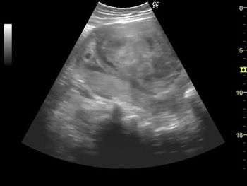Challenge your diagnostic skills. What uterine-related findings are revealed in this pelvic scan?