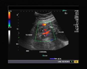 Name the vessels shown in this color Doppler image of a fetal abdomen in 22 week-old fetus. Is anything abnormal?