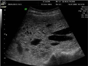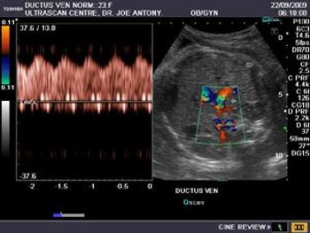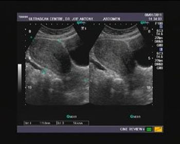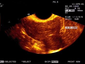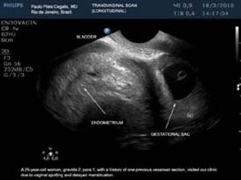 Sagittal image from a transvaginal sonogram in a patient with bleeding after a spontaneous abortion. The endometrium (between cursors) was thick and heterogeneous, measuring 8.5 mm in thickness (Fig1). Color doppler image in same patient shows focal flow (Fig. 2 - arrow) within the heterogeneous endometrium.