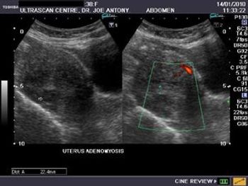 Is this lesion a fibroid or adenomyosis? Patient is a young (38n yr. old) married female with a history of dysmenorrhea and polymenorrhoea.