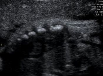 Normal aspect of the ossification centers of the fetal sternum at 33 weeks. Size of the ossification centers decreases in a cranio-caudal sense.