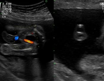 Single umbilical artery color doppler, transverse scan of urinary bladder shows single umbilical artery (left), transverse section of umbilical cord showing only two vessels: one vein and one artery (right).