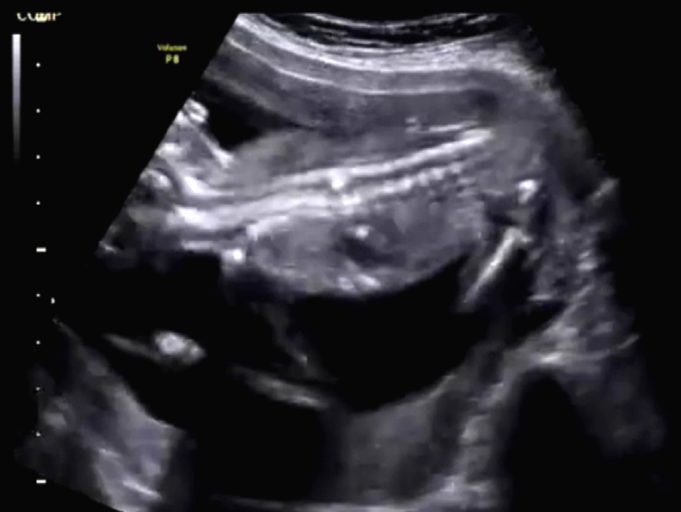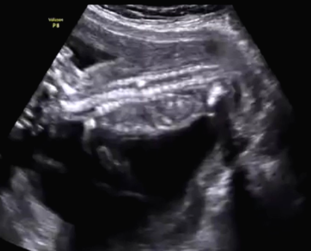 These images from a routine ultrasound examination of a 20-week fetus reveal a rare abnormality of the fetal spine.