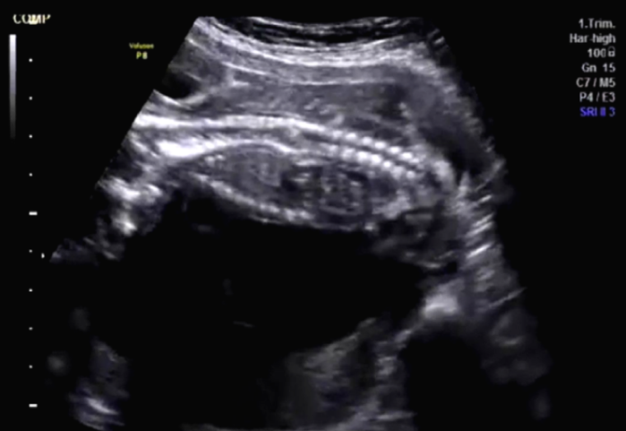 Imaging studies: This routine transabdominal obstetric sonography was performed to exclude any congenital fetal anomalies. The patient had not undergone any sonographic study prior to this scan. The images seen in Figure 1, Figure 2, and Figure 3 show the coronal section of the fetal spine and were taken during this routine sonographic examination.