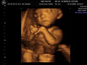 Description of image: 4D image of 29 weeks pregnancy, multiple anomalies: Clinch hand, omphalocoele, single atrium