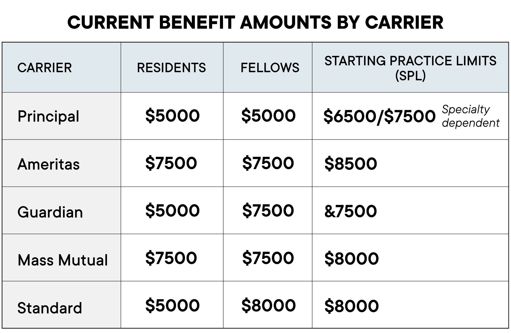 Historically, residents and fellows were offered the same benefit levels across carriers, regardless of their income or whether they had employer-provided group disability benefits. Today, that landscape has changed, creating more opportunities and confusion. The “Big 5” carriers—Principal, Ameritas, Guardian, MassMutual, and Standard—now differ in both their base offerings and their “starting practice limits” (SPL), which are available when trainees transition into their first attending role (Table).