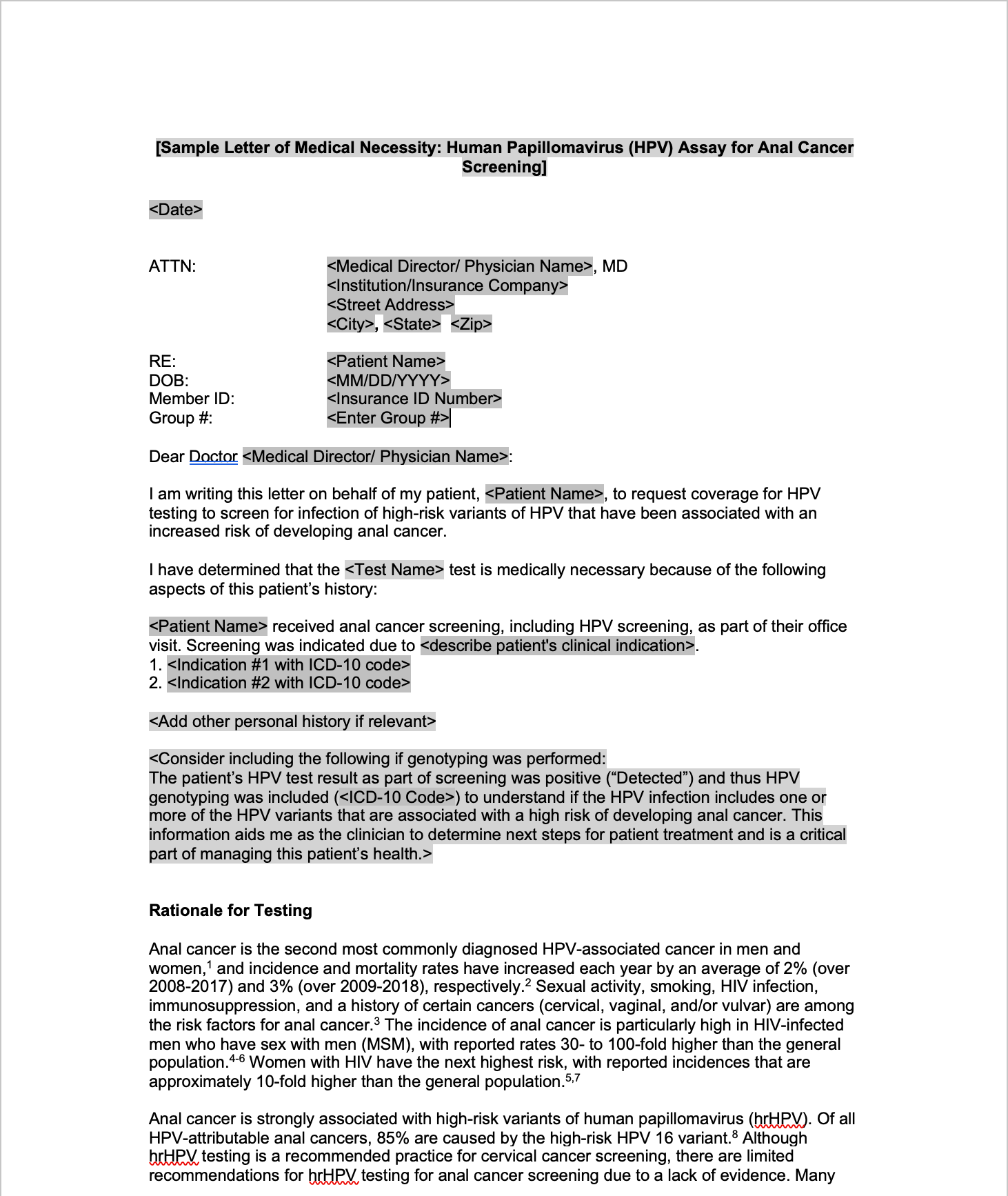 This is a Letter of Medical Necessity template is for for the HPV Assay for Anal Cancer Screening.