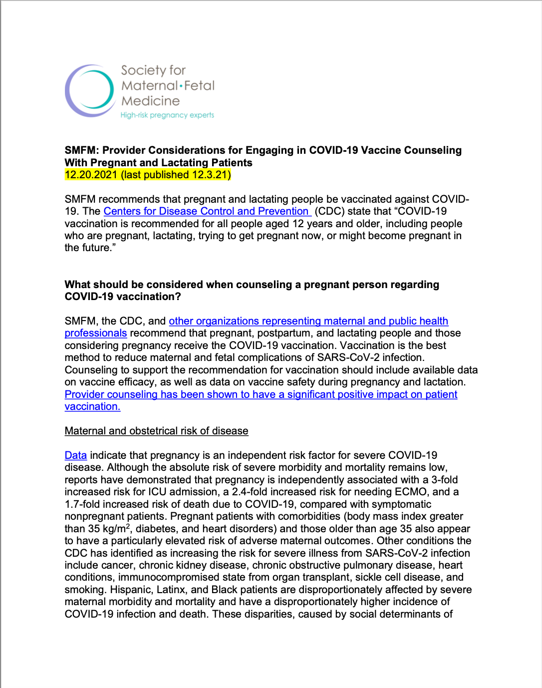SMFM provides update on provider considerations for engaging in COVID-19 vaccine counseling with pregnant, lactating patients