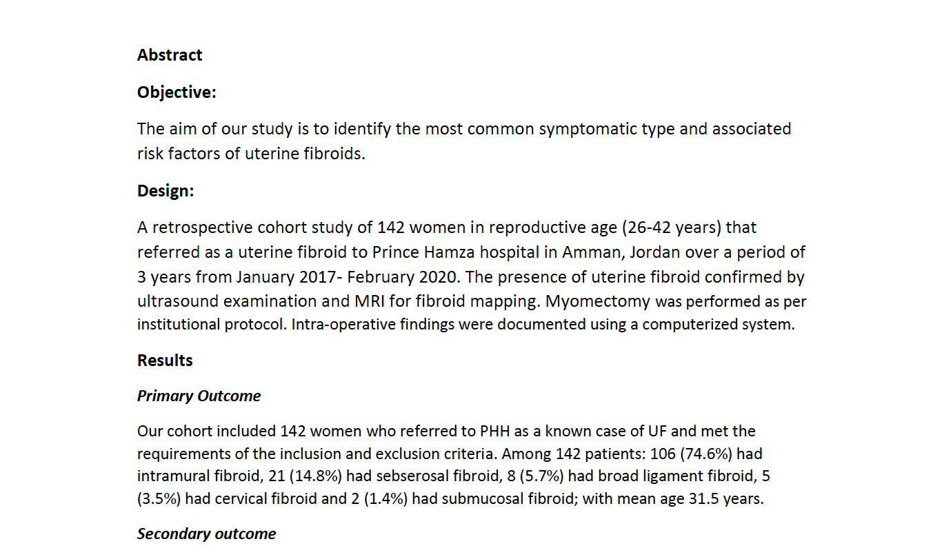 The study recruited 142 women of reproductive age (26 to 42 years old, mean age 31.5) who were referred for a UF to Prince Hamza Hospital in Amman, Jordan, over a period of 3 years from January 2017 to February 2020.