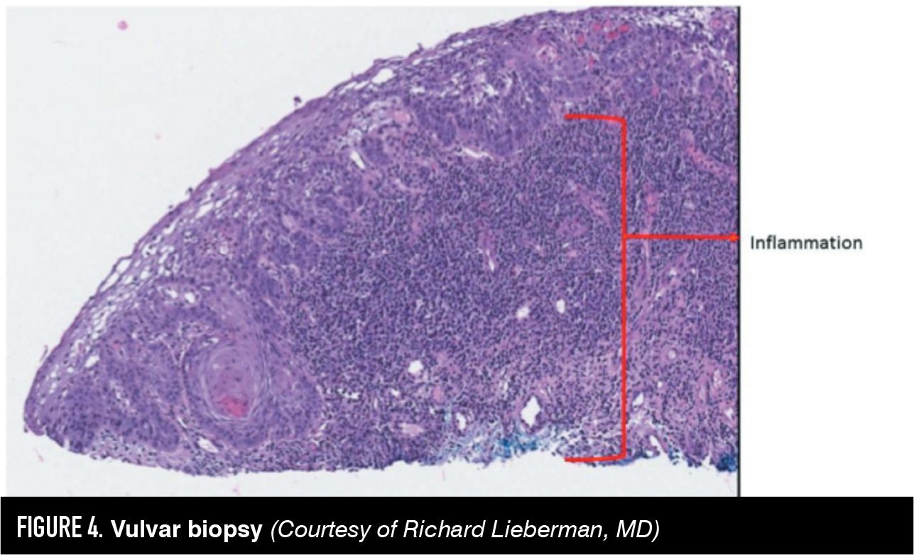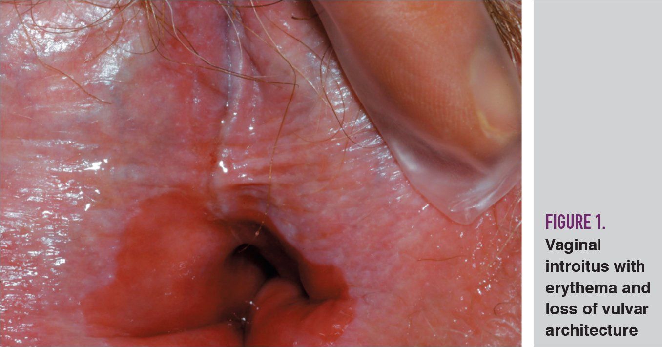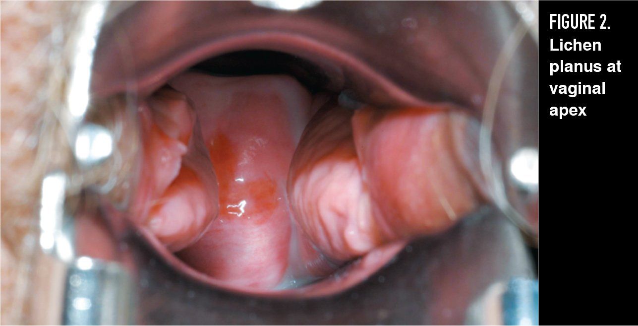 Based on this patient’s history and clinical examination, the most likely diagnosis is lichen planus (LP), a chronic inflammatory condition that can involve the skin, mucosa, scalp and nails.1 Vulvar LP is a subtype that involves the genital skin with or without involvement of the vagina. Women with vulvar LP may present with one of three subtypes-classic, papulosquamous, or erosive-and often present with complaints of itching, pain with intercourse, vaginal discharge, or bleeding. Some patients may be asymptomatic. The patient in this case represents the erosive subtype of vulvovaginal LP, which is the most common of the three.