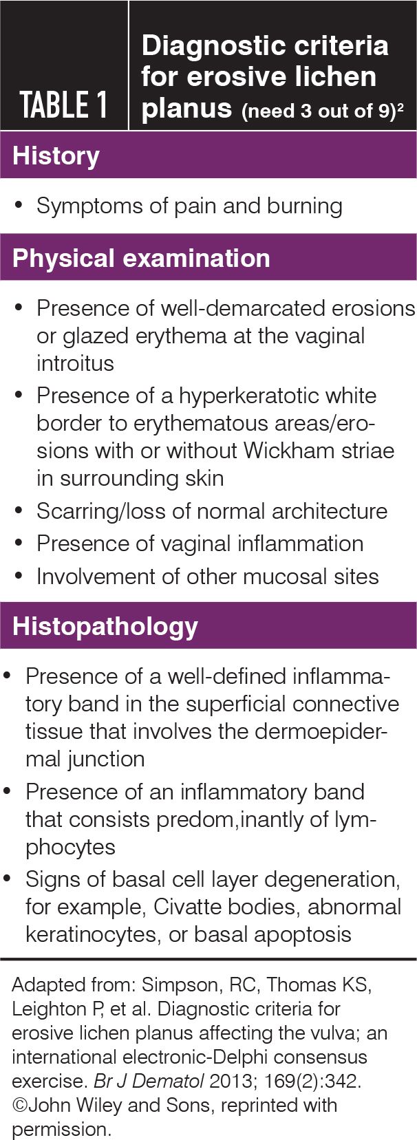 In 2013, diagnostic criteria for erosive lichen planus were created by electronic-Delphi consensus pooling of members of the International Society for the Study of Vulvovaginal Disease (ISSVD).2 Nine characteristics were identified with three of nine necessary to confirm the diagnosis (Table 1).2