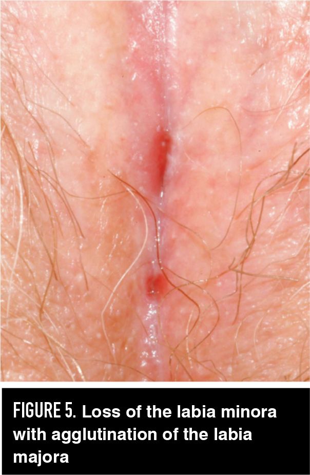 Despite these therapies, there are some cases in which vulvar and/or vaginal agglutination occurs despite conservative therapy (Figure 5). At the University of Michigan Center for Vulvar Diseases, we have developed and utilized a protocol to address this population of patients.12 Our protocol entails a combination of sharp dissection with blunt pressure with an end-to-end anastomosis sizer placed rectally to help define the plane between the vagina and the rectum.12 Once normal length and width are achieved, a foam dilator covered with two sterile condoms is placed in the vagina and secured via suturing the labia majora together.12 A Foley catheter is placed prior to this. The patient presents to clinic for removal of the dilator and Foley catheter 48 hours after surgery and then is started on a protocol of daily dilator therapy followed by high-dose intravaginal steroids.12 Refer to the referenced article for a video and also postoperative recommendations.12 Data from a small series at our center (11 women) have shown that 95% of patients were satisfied with their postsurgical result with 55% engaging in intercourse following surgery and 75% with improvement in voiding symptoms.12