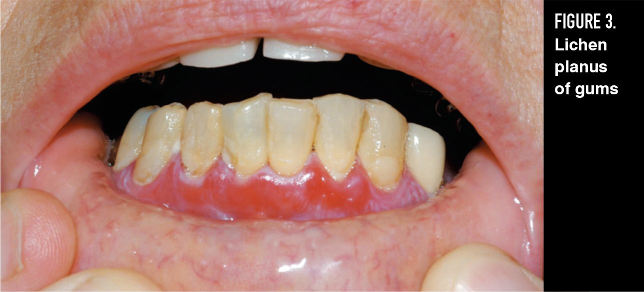 Erosions can lead to scarring, particularly in the vagina. Architectural changes with loss of tissue can also occur, as seen in Figure 1. Erosive LP can also involve other mucosal surfaces including urethral, oral (Figure 3) and esophageal mucosa. Vulvovaginal-gingival (VVG) syndrome is a specific erosive subtype involving each listed mucosal surface. Sites of involvement may not be concurrent, so history of prior site involvement or symptoms in those sites should be solicited.